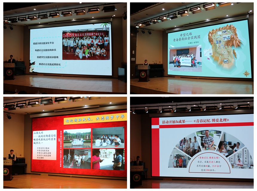 在成果展示環節,北京理工大學社會實踐品牌團隊和一等獎團隊代表分享了社會實踐的歷程和心得、經驗與收獲。社會調研類團隊——人文與社會科學學院 “天橋大學生社區主任助理”實踐團,志愿公益類團隊——機電學院“希望之路”青??破罩Ы虉F,體驗觀察類團隊——學生工作部“勿忘國恥·圓夢中華”德學先鋒實踐團,人物訪談類團隊——教育基金會75周年獻禮之“北理記憶”捐資人訪談實踐團,通過PPT、視頻等方式,為大家奉獻了一場精彩的社會實踐報告會,展示出了品牌團隊扎實的工作基礎和日趨完善的工作體系。