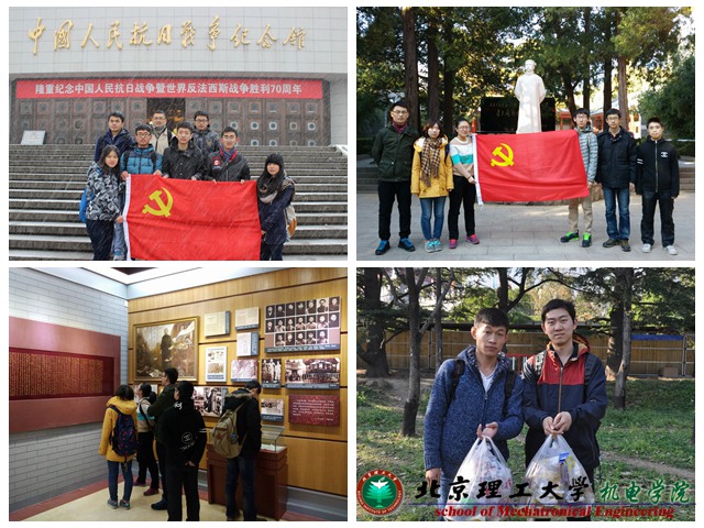 在理論學(xué)習(xí)的同時(shí),各支部將開展了形式多樣的參觀活動(dòng)與志愿服務(wù),將實(shí)踐與理論相結(jié)合,加強(qiáng)黨員的理想信念教育。14S3黨支部和2013級(jí)本科生第一黨支部各自參觀了中國人民抗日戰(zhàn)爭紀(jì)念館,參觀歷史遺跡,體會(huì)那段崢嶸歲月,堅(jiān)定了黨員的信仰和實(shí)現(xiàn)“中國夢”的信念。2013級(jí)本科生第二黨支部組織支部全體成員前往李大釗烈士陵園,祭奠和緬懷偉大的無產(chǎn)階級(jí)革命斗士,參觀了李大釗革命烈士陳列館。活動(dòng)增強(qiáng)了黨員黨性意識(shí),堅(jiān)定了思想,明確了為實(shí)現(xiàn)中國夢而奮斗的人生目標(biāo)。15S2黨支部組織支部全體成員前往香山景區(qū)清理垃圾,以實(shí)踐的方式發(fā)揮黨員的先鋒模范作用。
