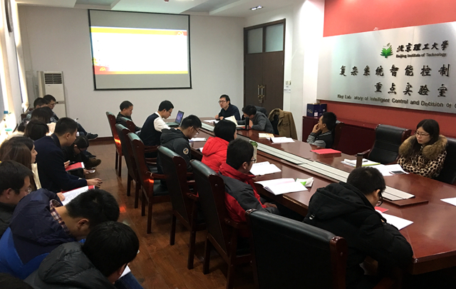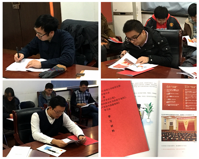 編輯:金林劍 審核:張宏亮 閱讀次數:按照北理工黨委對“兩學一做”學習教育中召開專題組織生活會和開展民主評議黨員的具體要求,自動化學院博士系統黨支部、15級碩士系統黨支部于2016年12月28日上午,在六號樓三層會議室召開第一環節工作,集體學習習近平總書記在黨的十八屆六中全會和在全國高校思想政治工作會上的重要講話精神、《關于新形勢下黨內政治生活的若干準則》(以下簡稱《準則》)和《中國共產黨黨內監督條例》(以下簡稱《條例》)。自動化學院院長助理、支部理論學習導師柴森春副教授,博士系統黨支部、15級碩士系統黨支部全體黨員參加了學習。本次會議由博士系統黨支部書記關子霄主持。