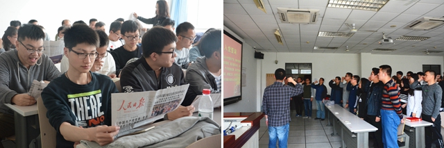左哲老師帶領大家一同閱讀了《人民日報》《習總書記系列講話讀本》等文刊,并向大家拋出了一個問題:“‘四講四有’應該如何解讀?”這一疑問在臺下引起了激烈的討論。學生支部書記魯怡表示:“‘四講四有’第一條講政治,有信念,就是要求共產黨員,尤其是年輕的共產黨員要不斷堅定理想信念,永遠牢記過去,反思現在,展望未來,這正是我們此次黨日活動的目的所在?!?/p>