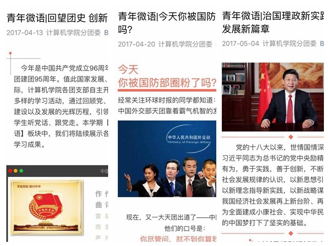 為擴大主題教育活動影響范圍,計算機學院在原有基礎上繼續加強網絡思政平臺建設。本學期工作中,為推動宣傳工作接地氣,計算機學院在學生中遴選了一批青年評論員,通過簡明的語言普及黨的十八大以來我國的社會經濟發展、時政熱點、黨史團史等理論知識,在學生群體中反響良好。截止至今,計算機學院共利用BITCS微信公眾號發布青年學習評論文章7篇,累積點擊量千余次。
