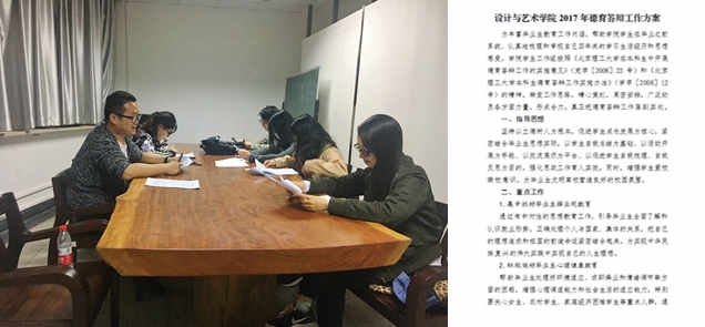 4月,學院成立以黨委副書記副院長孫飛為組長,輔導員、班主任、畢業班班長為組員的德育答辯工作小組,認真學習和貫徹文件精神,通過院務會、德育答辯工作小組會議的形式召開組織籌備會,根據“大學 青春 人生”主題,制訂今年德育答辯的具體實施方案,并形成文件《設計與藝術學院2017年德育答辯工作方案》。方案確定以后,學院通過網站公告欄、畢業生微信群等網絡形式進行了廣泛的宣傳,并以紙質文件的形式下發到各畢業班,并先后召開班長支書例會、畢業生動員會,傳達有關精神和具體實施方案,即時解答同學的疑問,保證將宣傳工作覆蓋到每一位畢業生。