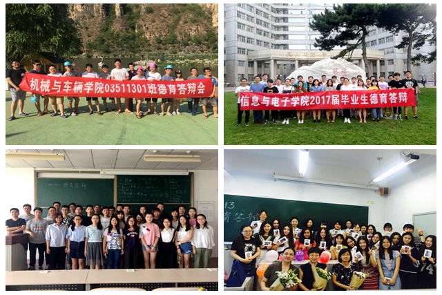 各班級學(xué)生在德育答辯時也暢所欲言,借助視頻、音樂、圖片等多種媒介進行形式多樣的德育答辯。機械與車輛學(xué)院03511301班選在十渡風(fēng)景區(qū)作為德育答辯的場地,以寧靜生活、積極進取、團結(jié)一致答辯主題,選取寧靜的農(nóng)家院、仙西山、竹筏場地為答辯地點,在歡快、放松的環(huán)境下進行了不一樣的答辯;信息與電子學(xué)院05111311班全體同學(xué)在中心花園順利舉行了德育答辯結(jié)題報告會,來自電子信息工程信號與圖像處理方向的31名同學(xué)暢談自己的大學(xué)生活,總結(jié)了四年來的成長經(jīng)歷;化學(xué)與化工學(xué)院10411301班德育答辯沒有采取以往每位同學(xué)單獨講ppt的形式,而是以“我的四年是一首歌”為主題,每人根據(jù)個人四年生活,推薦一首能代表此刻心情的歌曲,與大家在歌聲里分享四年心路歷程;外國語學(xué)院24131301班精心為每一位老師和學(xué)生制作了一套明信片,每一套里面都包含所有德語系教師和學(xué)生的照片,并且專門將各個老師和學(xué)生的照片放在了封面,作為德育答辯的紀念禮物,為每個即將離開北理的學(xué)子們留下珍貴的回憶。