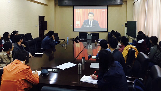 上午九時(shí),在學(xué)院黨委的組織倡議下,學(xué)院師生分別于中教515會議室、534教室以及徐特立圖書館602室集中觀看十九大開幕會直播,在寢室的學(xué)生和海外游學(xué)的學(xué)生主動通過網(wǎng)絡(luò)媒體收看收聽十九大開幕會盛況。大家為總書記報(bào)告中提出的綱領(lǐng)、描繪的藍(lán)圖振奮不已,對黨和國家未來的發(fā)展充滿期待。