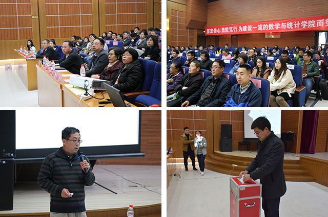 黨委書記高偉濤同志做了題為《堅定信心 勇毅篤行 為建設一流的數學與統計學院而努力奮斗》的報告。報告回顧了四年來,在學校黨委行政的正確領導下,學院黨委帶領全院師生在黨建及思想政治教育、教學及人才培養、學科建設及科學研究、師資隊伍建設、國際交流與合作、文化氛圍建設等方面取得的成績,并對學院黨委未來的工作提出了建議,希望新一屆黨委堅持學習宣傳貫徹黨的十九大精神,以習近平新時代中國特色社會主義思想為指導,以深入推動“雙一流”建設為目標,努力提高學院師生的思想政治素質,加強基層組織建設,提高治院辦學能力,創建激情進取的發展氛圍。