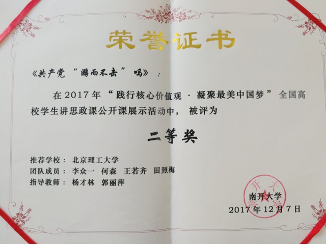 北理工在2017年“全國(guó)高校學(xué)生講思政課公開(kāi)課”展示活動(dòng)中榮獲二等獎(jiǎng)