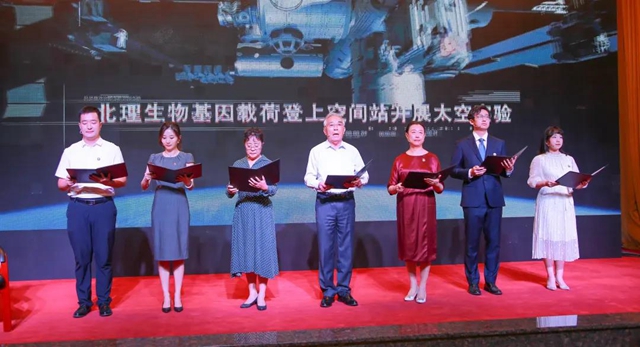 榮休教師代表、光電學院白廷柱教授為新教師代表、化學與化工學院青年教師孫建科佩戴校徽,希望將北理工精神和為師之道薪火相傳。孫建科帶著榮休教師們的寄托,帶領全體新入職教師莊嚴宣誓,誓言堅定,表達了北理工新一代青年教師們站在新的起點,為黨育人、為國育才的堅定信念。
