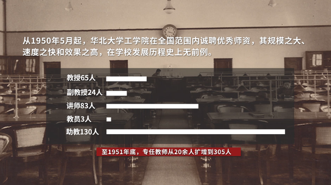 這一時期,為適應新的形式與任務,華北大學工學院與重工業部一同組織各方力量,在全國范圍內誠聘優秀師資,其規模之大、速度之快和效果之高,在學校發展歷程史上無前例。截至1951年年底,全校專任教師從20余人迅速發展到305人,其中教授65人,副教授24人,講師83人,教員3人,助教130人。其中包括一大批國內知名專家: