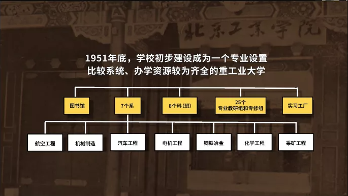 至1951年年底,學校已建立了航空工程、機械制造、汽車工程、電機工程、鋼鐵冶金、化學工程、采礦工程等7個系、8個科(班)和1個研究所,設立25個專業教研組和專修組,建立了實習工廠和圖書館。學校初步建設成為一個專業設置比較系統、辦學資源較為齊全的重工業大學。