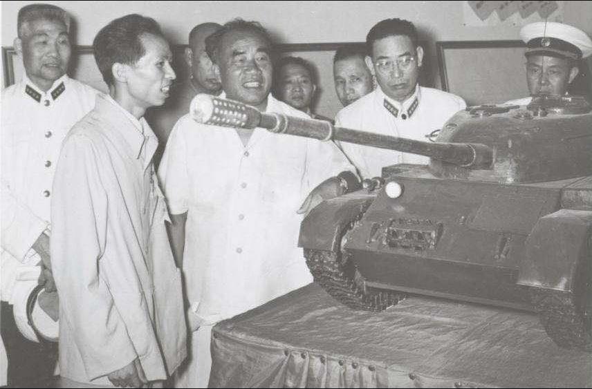 1958年“八一獻(xiàn)禮”展覽會(huì)上,葉劍英元帥(中)觀看我校研制的輕型坦克模型