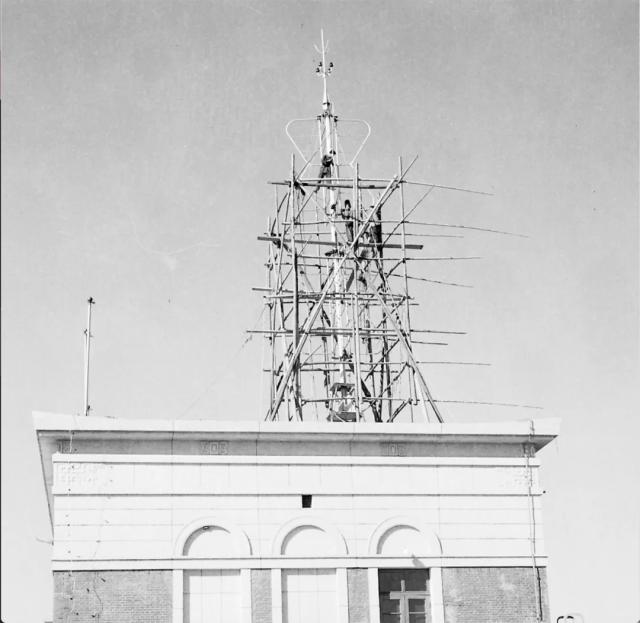 在學校主樓頂端矗立的電視發射天線