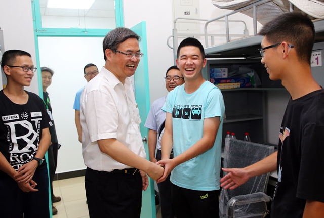 學校黨委書記趙長祿、校長張軍、副校長王曉鋒、副校長李和章、黨委副書記包麗穎和校長助理汪本聰?shù)刃nI導來到迎新現(xiàn)場,與前來報到的新生及家長熱情交流,親切慰問迎新志愿者和工作人員,并走訪學生宿舍,了解新生情況。此外,校領導還帶隊還檢查了睿信書院、明德書院辦公空間和求是書院社區(qū)空間的建設情況。