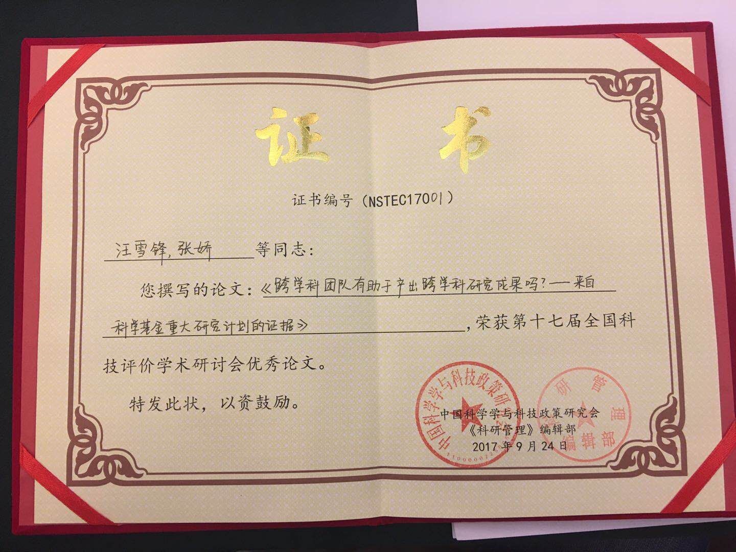 2017年9月23-24日,北京理工大學知識管理與數據分析實驗室2016級碩士生張嬌在第十七屆全國科技評價學術研討會上獲得優秀論文獎,并被組辦方選擇作為熱點話題之一進行單獨匯報討論,受到與會學者的廣泛關注,這也是實驗室研究生連續第三年獲此殊榮,進一步提升了我校在技術創新管理和科技評價領域的影響力,為我校贏得廣泛贊譽。據悉,本次會議共收到來自國內高校、科研院所及企事業單位專家學者的350余篇學術論文,經專家多輪嚴格評審,最終11篇論文獲優秀論文獎。中國科學學與科技政策研究會理事長穆榮平研究員,《科研管理》編輯部王萍主任為獲獎作者頒發優秀論文證書。